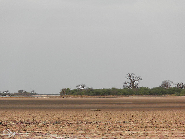 Als wir schließlich zur letzten Etappe für heute in Richtung Foundiougne aufbrechen, ist der Himmel leicht bewölkt. Hinter Fatick wird die Straße schnell einsam und geht nach einigen Kilometern in eine befestigte Piste über, die gerade einmal ein bis zwei Meter über das Grund- bzw. Wasserniveau aufgeschüttet ist. Zur Regenzeit stehen die Flächen rechts und links der Straße dann unter Wasser. Dies ist ja ein Teil des weitläufigen Saloum-Mündungsdeltas. Im Moment aber bestimmen trockene Flächen in verschiedenen Beige- und Grautönen bis hin zum Weiß der Salzreste das Landschaftsbild. Vegetation findet sich nur auf leicht erhöhten Lagen, Siedlungen entlang der Strecke gibt hier in der Gegend keine.